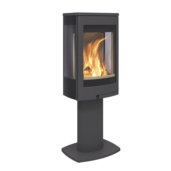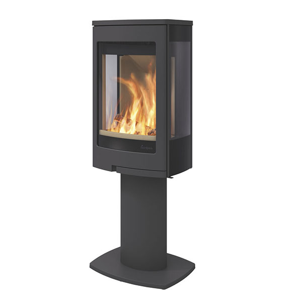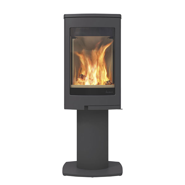 Nordpeis Duo 1 mit Sockel ist ein moderner Kaminofen mit einer großen Glastüre und Seitenscheiben. Das bietet eine gute Sicht auf die Flammen. Dieser Kaminofen eignet sich in einer Ecke genauso wie an einer Wand. Er kann mit einer externen Luftzufuhr verbunden werden. Diese sollte in gut isolierten Häusern mit geringer natürlicher Lüftung verwendet werden.
