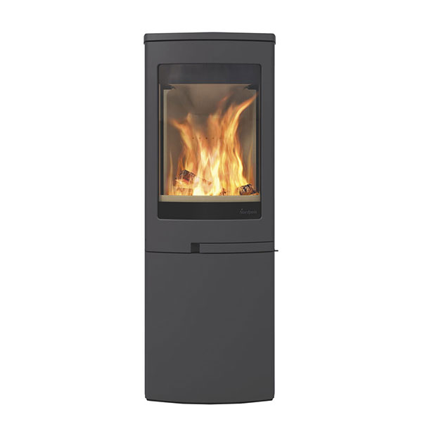 Nordpeis Duo 4 hat einen Sockel mit einer Tür und elegante Seitenscheiben. Dieser Kaminofen beansprucht wenig Bodenfläche und eignet sich für Ecken, an einer Wand oder freistehend. Scheibenspülung sorgt für länger sauberes Glas und die Brennkammer bietet eine gute Sicht auf die Flammen von allen Seiten. Dieser Kaminofen kann mit einer externen Luftzufuhr verbunden werden. Diese sollte in gut isolierten Häusern mit geringer natürlicher Lüftung verwendet werden.