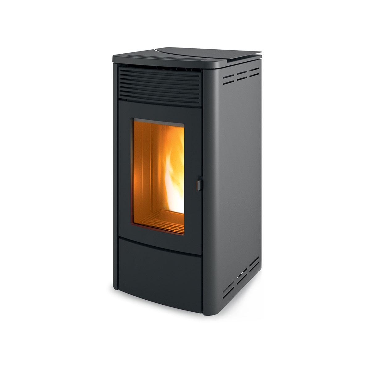 Pelletofen mit geringer Leistung (6 kW). Er hat Topplatte aus Gusseisen und Seitenteilen aus lackiertem Stahl (Bordeaux, White, Dark, Silver). Serienmäßig integrierte erweiterte WLAN Kontrolle mit Maestro Technologie.