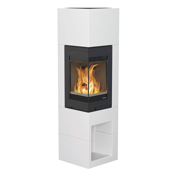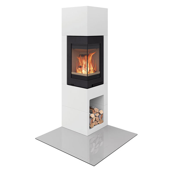Nordpeis Odense hat einen zweiseitig verglasten Heizeinsatz, wodurch man die Flammen von allen Seiten aus sehen kann. Der Sockel besteht aus einem praktischen Holzfach. Die Brennkammer ist hoch verbaut, was eine gute Sicht von mehreren Blickwinkeln ermöglicht. Die schlanke Kaminanlage braucht wenig Bodenfläche und kann freistehend, an einer Wand oder in einer Ecke platziert werden.
